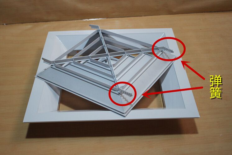 方型散流器使用該類型散流器時要與調(diào)節(jié)閥配合使用,才能在系統(tǒng)中得到理想的氣流分布。此風口的葉片角度為固定式,不能隨意調(diào)節(jié),整個葉片與邊框采用分離結(jié)構(gòu)